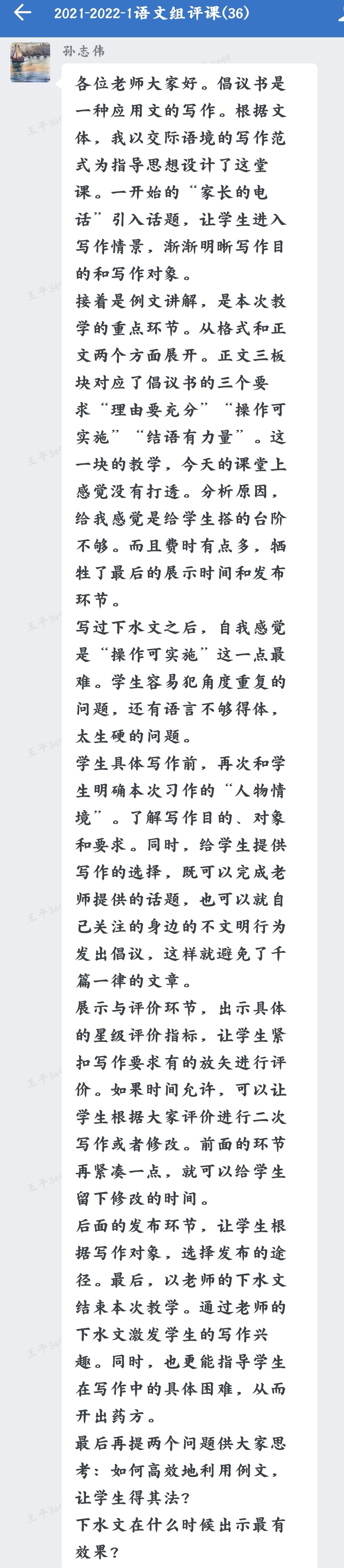 课后,孙老师将自己的设计思路做了阐释,同时提出了备课过程中的问题供大家思考。语文组老师们对本节课进行了热烈的研讨。讨论的角度包括“下水文的出示时机”“写作话题产生的途径”“先写后教”“例文分析先整体再局部”等。在大家的思维碰撞中,应用文该如何教的问题在老师们心中逐渐清晰,外延了“新体验作文”教学的题材,培养了学生的语文素养,推动了“小学新体验作文”在苏州市基础教育内涵立项项目“苏式新时代有效课堂研究项目”“小学语文课程基地项目”的研究。