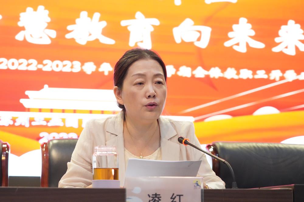 校长室作新学期重点工作部署。凌红校长从五个方面对新学期学校工作作全面部署:实施课程高品质融合工程,赋能“双减”提质增效;实施德育高品行融合工程,营造更有合力的育人生态;实施强师高品格融合工程,打造更有活力的育人队伍;实施智慧校园高速度融合工程,促进学校教育变革发展;实施安全保障高品位融合工程,构筑平安幸福的文萃家园。