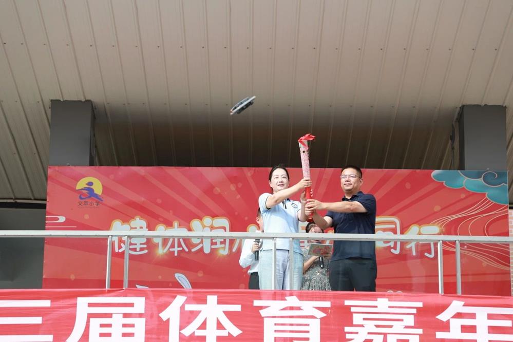 校家社齐携手, 同心同行向未来。火炬接力点燃了全场的梦想与激情。学生代表手持火炬,教师代表、家长代表全程守护。当学校领导和社区书记共同举起火炬的那一刻,全场沸腾了。校家社三方联动,奥林匹克体育精神、校家社合作精神、六大积极品质在这一刻完成了传承。党总支书记凌红、校长王兆正宣布文萃小学第十三届体育嘉年华暨校园运动会开幕。