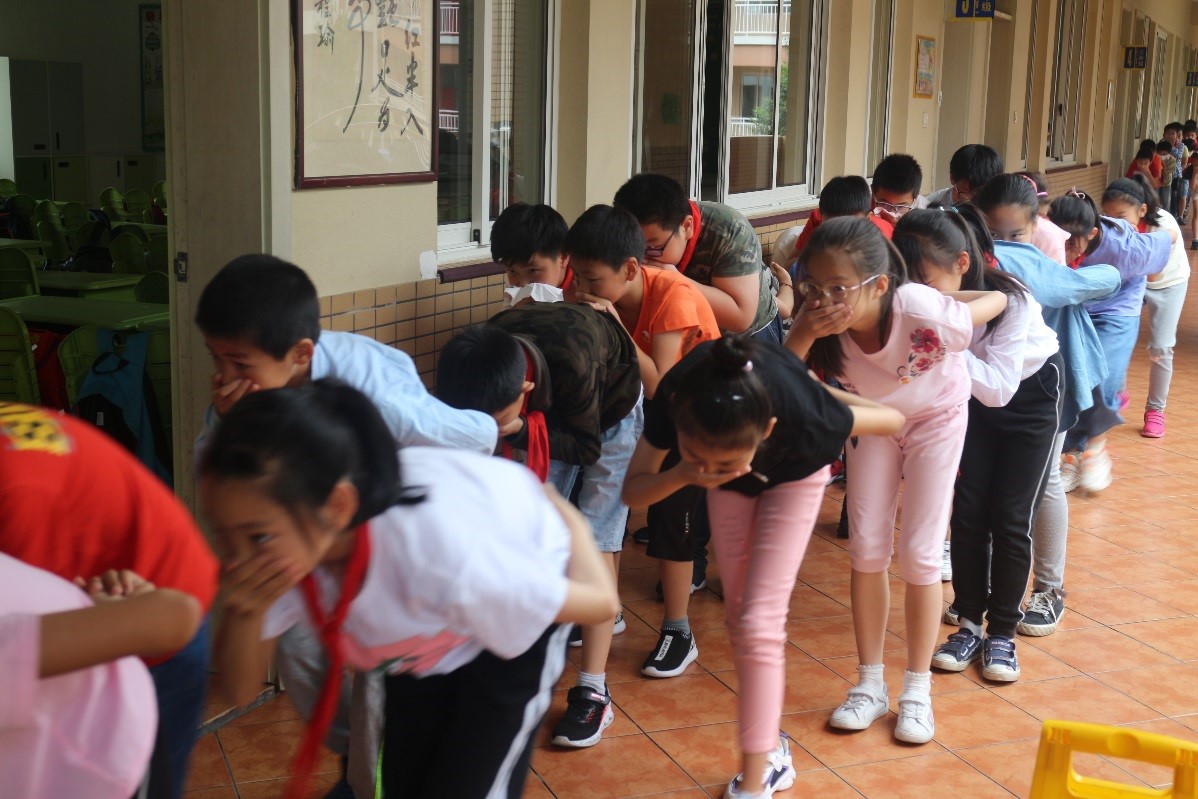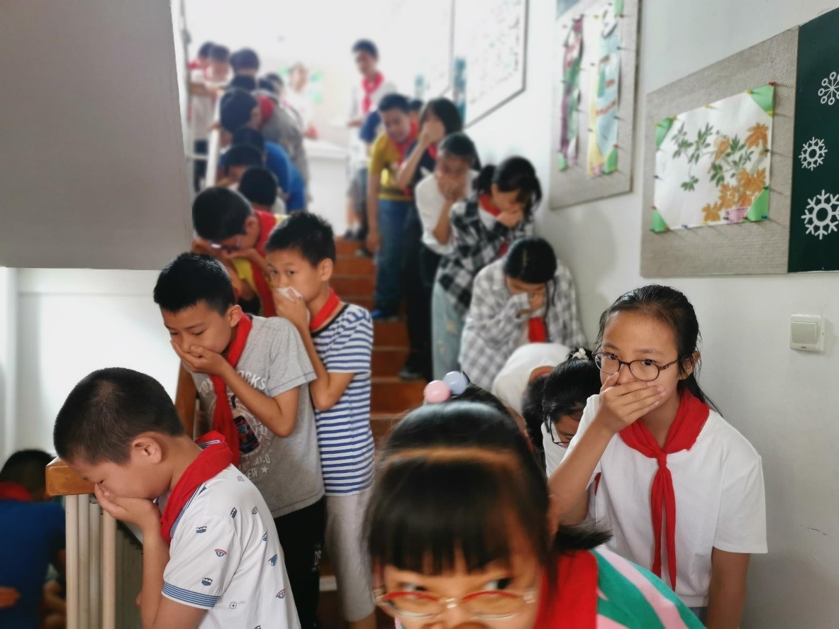 6月19日早上9点10分,苏州工业园区文萃小学突然响起了校园警报的声音,随着广播里播报“现在文知楼发生火灾,文知楼师生立即疏散”的声音,伴随着反复播放的每分钟60次节拍音长鸣60秒,停30秒的合成声,在文知楼上课的学生们在各班老师的指挥下,弯着腰、猫着步,用手帕、毛巾等捂住口鼻,沿着学校原先划定的通道快速前进,紧张有序地向操场集中。5分钟后文思楼的演练活动继续有条不紊地展开。