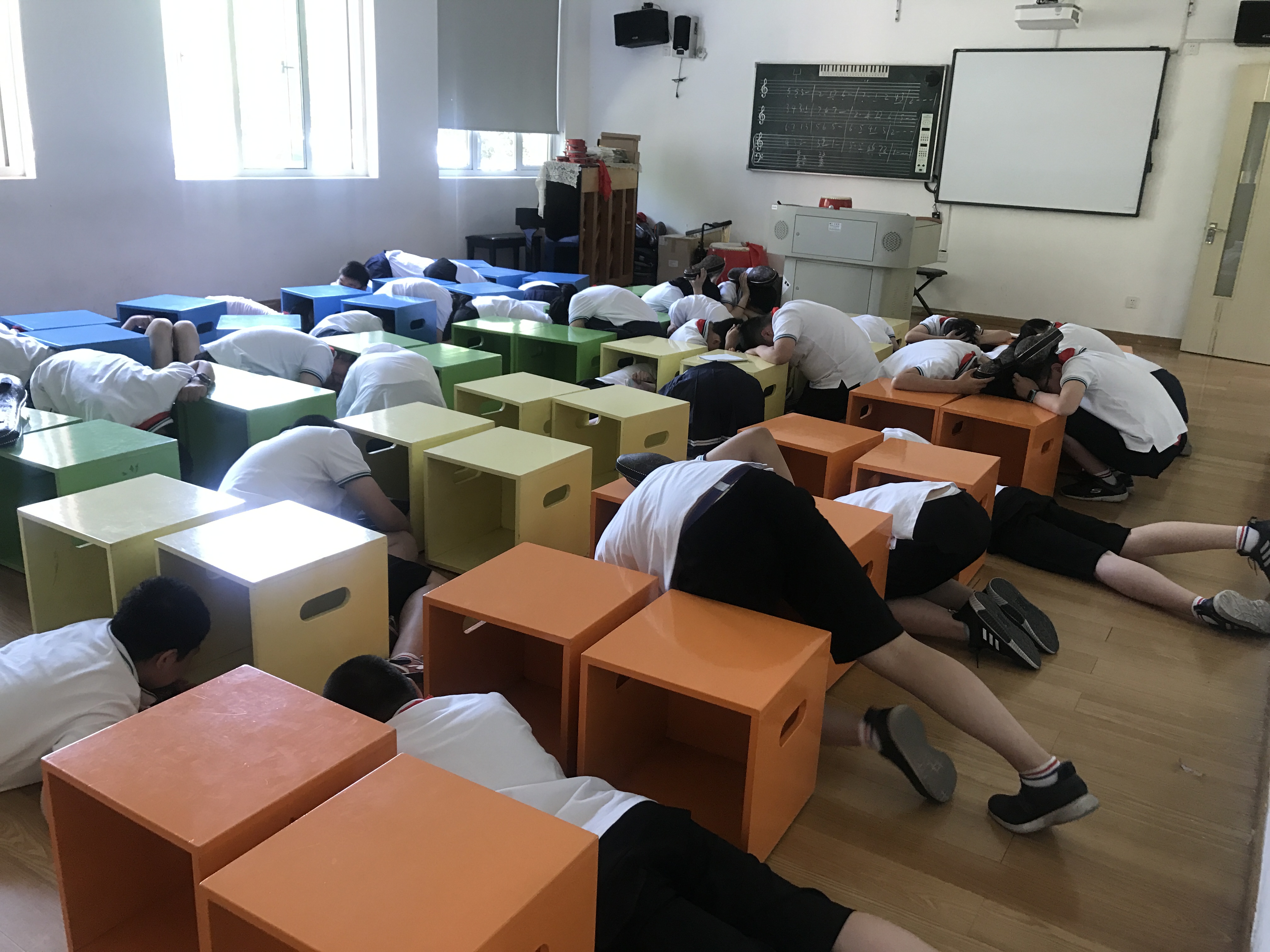 下午2点35分,骄阳似火,随着警报声的响起,全校师生都立刻进入到高度紧张积极防震的状态。所有学校领导和各个疏散口的老师,各就各位第一时间在各楼梯口,专业教室门口维持秩序。学生在任课老师的指导下先迅速就近躲避,按要求蹲到课桌下。各专业课教室的老师也在第一时间组织学生应急避险,音乐教室、体育馆,以及书法教室的学生因地制宜就近躲藏。随着疏散命令的下达,学生在教师们的组织下紧张有序地从教室出发,沿着预定路线,在各楼梯口安全老师的指引下快速有序地向操场紧急疏散。到达集合点后,教师清点人数,检查学生“受伤”情况。班主任以最快的速度查看学生是否全部安全撤离后,即刻报告本班情况。整个演习过程行动敏捷、秩序井然。