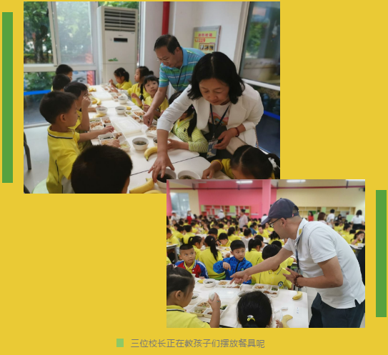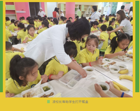 到了用餐时间,三位校长连同所有一年级的老师们一起为新生做好服务工作。在老师们耐心的引导下,新生都能有序地入座、安静地用餐,孩子们品尝着可口的饭菜,脸上洋溢着幸福的笑容。