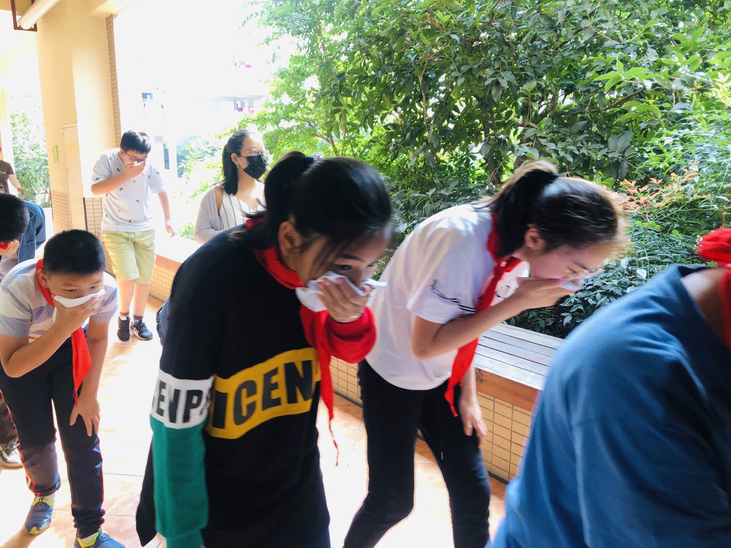 9时50分,文知楼响起“现在文知楼发生火灾,文知楼师生立即疏散。”的疏散指令。文知楼师生立即有序响应,走廊上教师组织学生快速集合,楼梯间内师生以两路纵队迅速通过,其中靠墙一路通过时用手扶墙,靠栏杆一路手扶栏杆,疏散队伍快速安静有条不紊。9时55分,文思楼响起指令“现在文思楼发生火灾,文思楼师生立即疏散。”各班学生不慌不乱,在老师的带领下,严肃认真,撤离有序。师生按要求到达指定集结区域,各班学生按4路纵队蹲下,班主任及时清点并上报本班人员情况。整个活动中,每一位师生都表现出极高的安全素养,护导区域老师认真站岗,确认最后一位学生离开教学楼后才开始向安全区域撤离。
