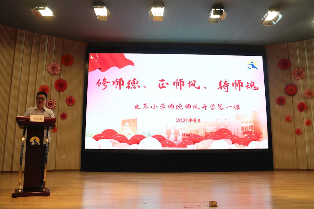 初秋玉露清,早雁出空鸣。8月26日,初秋开学之际,文萃老师们相聚一堂,于文心剧场开展了以修师德、正师风、铸师魂为主题的师德师风第一课的专题培训活动。