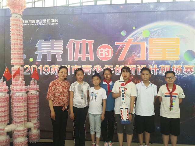 5月,我校科技社团代表队参加了2019年苏州市青少年创新设计大赛“集体的力量”中的三个项目。在比赛现场由郭晶晶老师带领的六名学生向裁判老师展示了我校“1到无穷”的代表作品“天宫二号发射场”,获得苏州市二等奖第一名的好成绩。