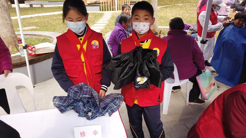 别看队员们人小,做起事来格外认真负责。他们和社区志愿者一起做起了各项志愿服务。这里几个忙着帮忙登记前来修伞的名单,那里几个忙着引导前来磨刀的爷爷奶奶。