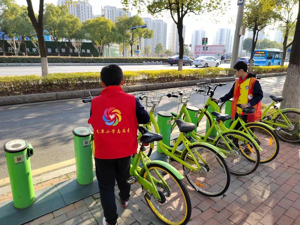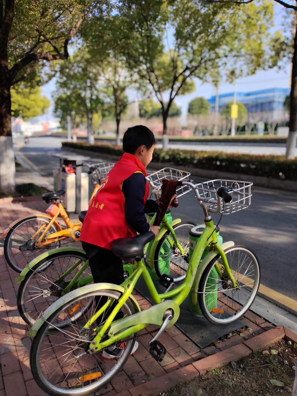 慰问结束后,孩子们也不闲着,继续奔赴下一旅程。在社区旁的共享自行车区域,车把、车篮、车身......他们认真细致地擦拭着每一处手指能碰到的地方。看,孩子们擦得多认真呀!
