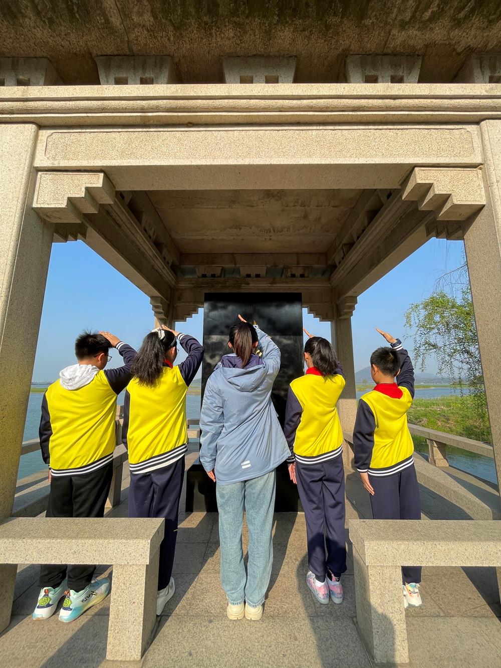站在太湖英魂纪念碑前,回想五位革命先烈在难以想象的困难面前以共产党人的理想、信念和毅力,顽强坚持了20个日日夜夜。队员们和辅导员老师集体默哀,用队礼向保家卫国的英烈致以最崇高的敬意。