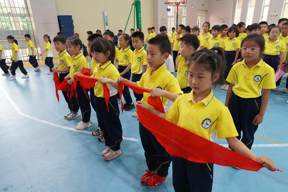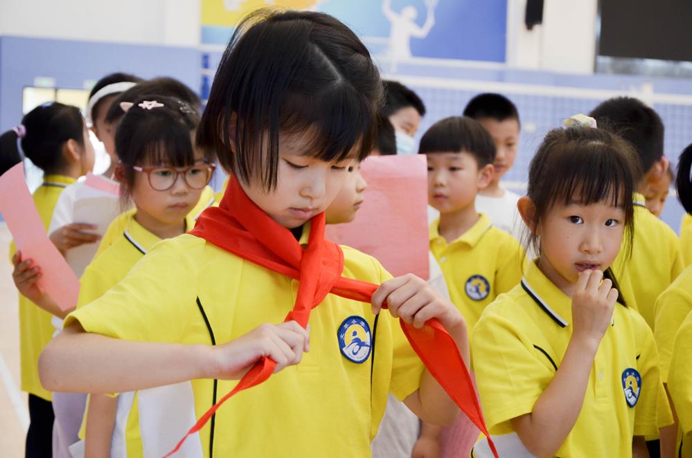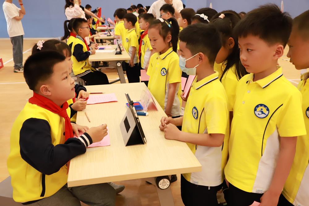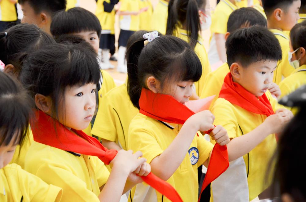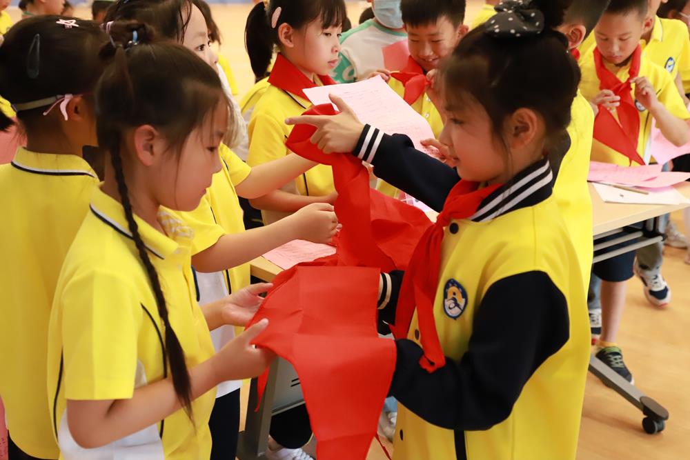 瞧,一年级的小萌娃们在老师的带领下,手拿争章集星卡来到了第一关。每一位同学都能熟练、认真地佩戴红领巾,唱队歌时声音洪亮、情绪饱满,在嘹亮动听的歌声中,胸前的红领巾也显得愈加鲜艳。