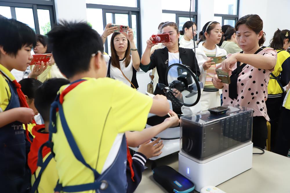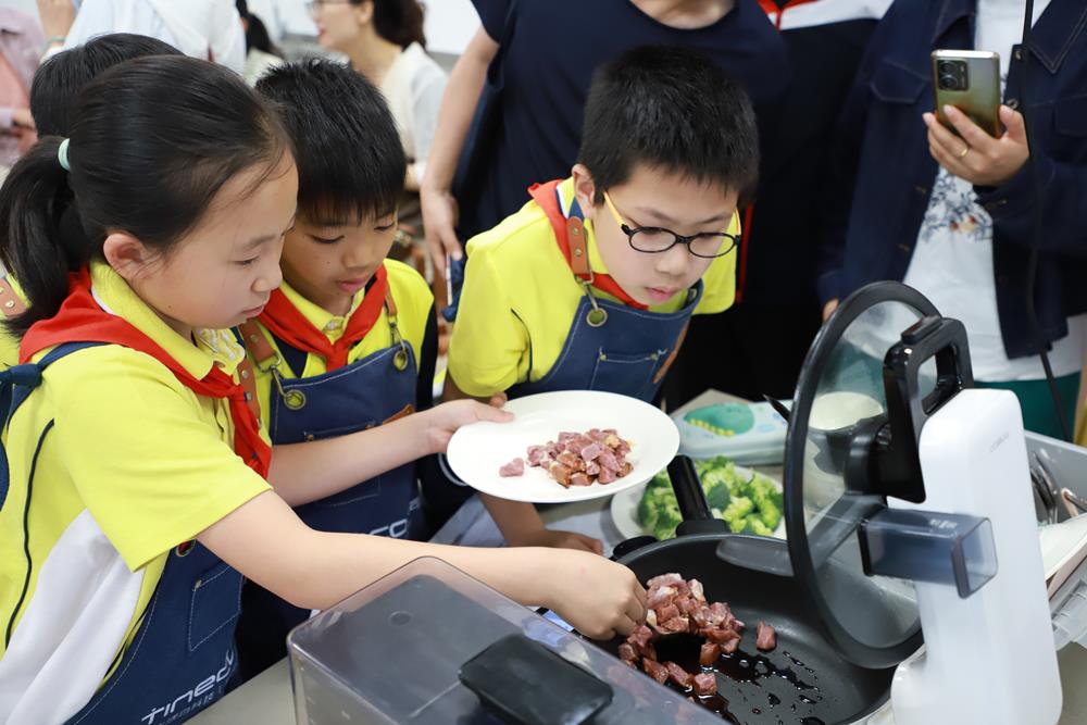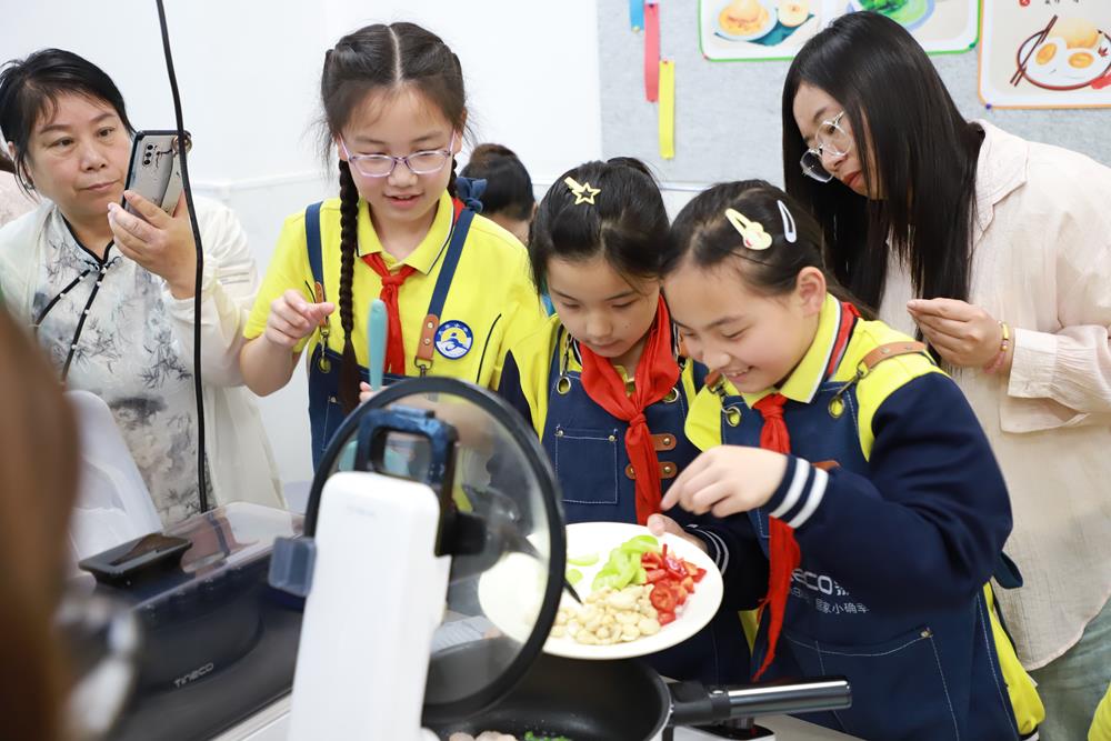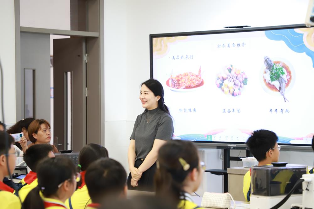 活动的第二阶段是课堂展示环节。老师们首先来到烹饪教室,在烹饪教室里,文萃小学吴旭君老师和季微微老师带来的跨学科作文展示课《介绍一种事物》。在两位老师的引导下,孩子们熟练地使用烹饪机器人,将食材按步骤制作成美味的食物,把制作的过程和感受记录下来,整个过程中,孩子们兴致盎然,在场的老师们不时地按下快门,记录下精彩的瞬间。
