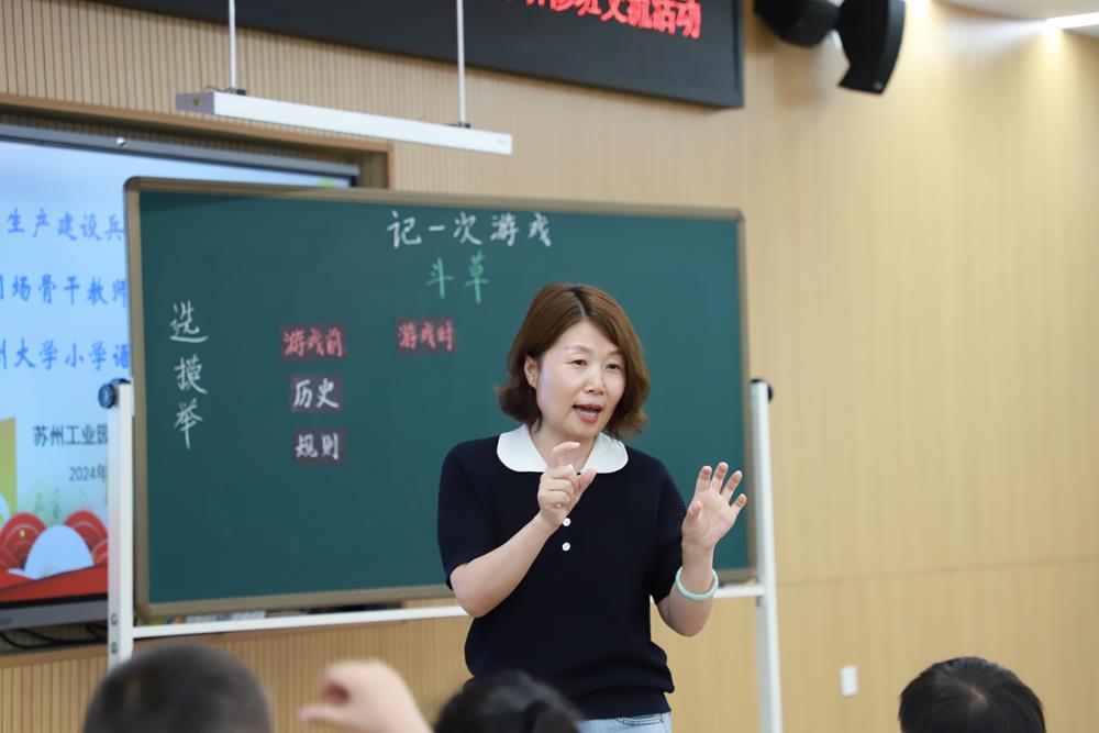 在三楼培元中心,文萃小学副校长沈建琴为老师们带来了一场精彩的新体验作文习作课《记一次游戏》。沈校长在课堂上带领孩子们体验了传统游戏“斗草”,孩子们在游戏前充分了解游戏的历史和规则,在游戏中积极体验,在游戏后充分交流,写出了一篇篇精彩的习作片段。整堂课中,同学们更是充分体会到了传统游戏的魅力。