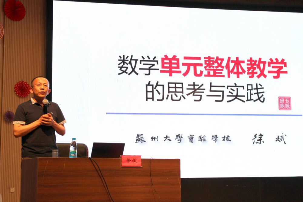 全国著名特级教师徐斌对于今天的两节课例做了精准的评课,并以《数学单元整体教学的思考与实践》为题,从单元整体教学的理论依据、具体要求、实践路径三方面带来了专题讲座。他指出,新课标的发布带来了数学课程改革的新机遇和新挑战,基于主题的单元整体教学是新课标提出的新理念,需要我们积极思考并行动起来,根据学生已有的知识经验、认知水平、学习要求,结合新课标理念和教材编排,大胆实践。