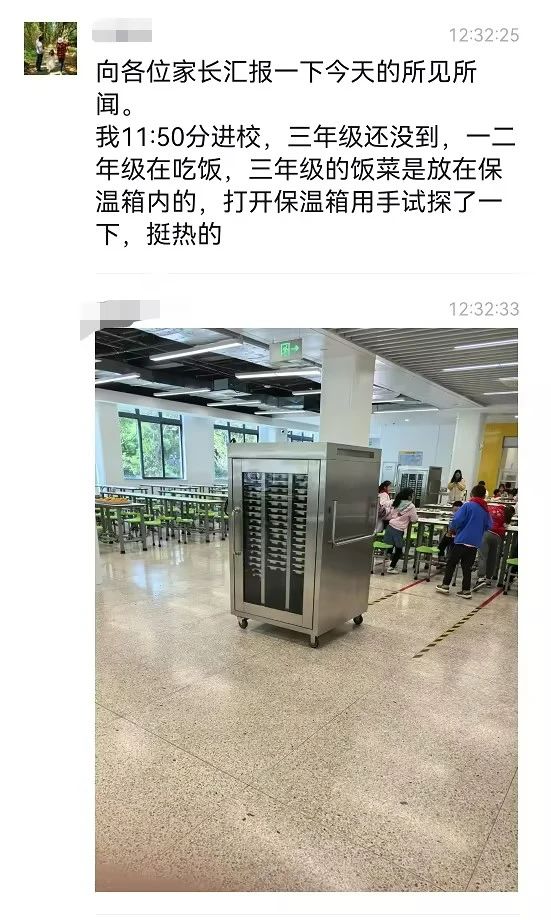 家长志愿者们可以主动提出申请,入校陪餐并考察食堂实际工作情况。近日,三年级家长毛先生主动提出要来学校食堂看下用餐情况。他在就餐过程中,不仅关注饭菜的口味、质量,还细心观察学生们的用餐习惯,并把自己的所见所想分享在班级群中,让其他家长也能一起了解学校食堂的经营情况。家长陪餐制度,不仅加强了对食堂饭菜质量的监督,也增进了家长与学生之间的情感交流。