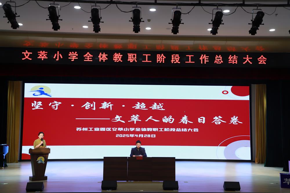 四月的阳光温柔而不炙热,繁花褪去,绿叶成荫,万物在这个时节蓬勃生长。在这充满希望与活力的季节里,4月28日下午,苏州工业园区文萃小学召开全体教职工阶段工作总结大会。全体教职工齐聚一堂,共同回顾过往工作的点滴,总结经验、凝聚力量,为接下来的教育教学工作明确方向。