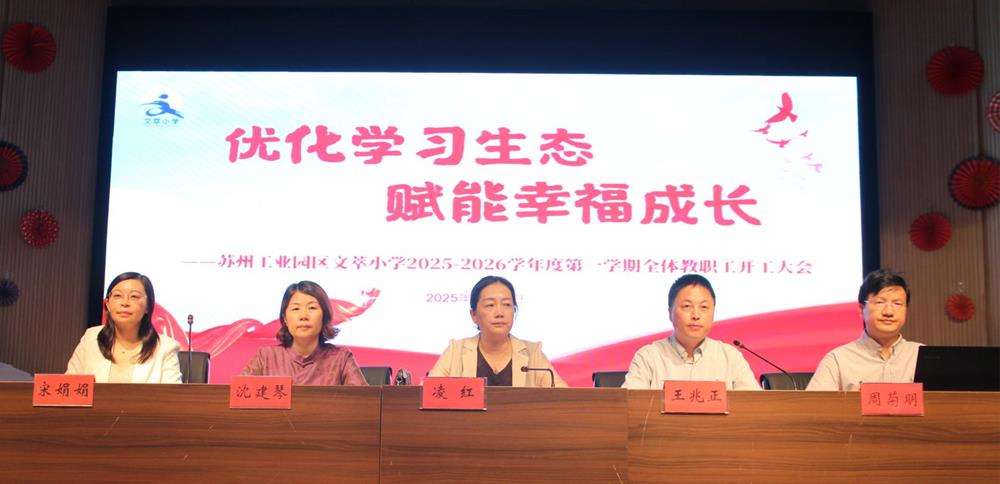 天高云淡,秋阳正好。8月28日上午,苏州工业园区文萃小学全体教职工在文心剧场召开了2025-2026学年度第一学期开工大会。本次大会以“优化学习生态 赋能幸福成长”为主题,由党政办主任蒯江萍主持,全体教职工以饱满的精神状态共同开启新学期征程。